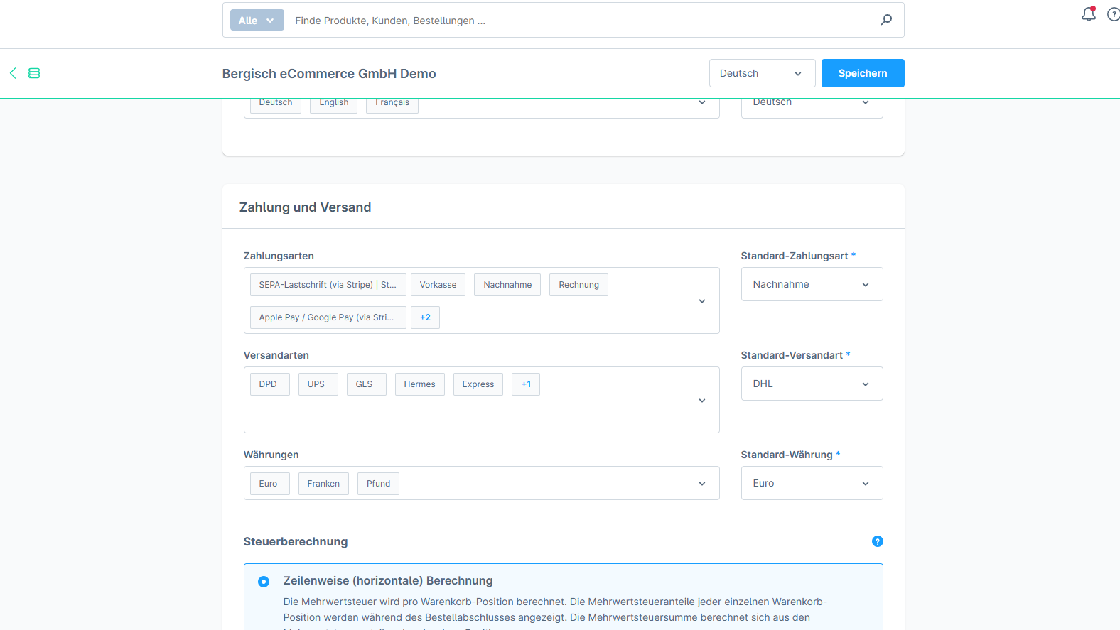 Solltest du eine andere Versandart benötigen, hast du die Möglichkeit unter Versand diese anzulegen und Lieferzeiten anzugeben, eine Beschreibung zu hinterlegen, ein Logo für die Versandart hochzuladen, die Tracking-URL einzutragen sowie Verfügbarkeitsregeln, Steuerberechnungen und eine Preismatrix zu hinterlegen.