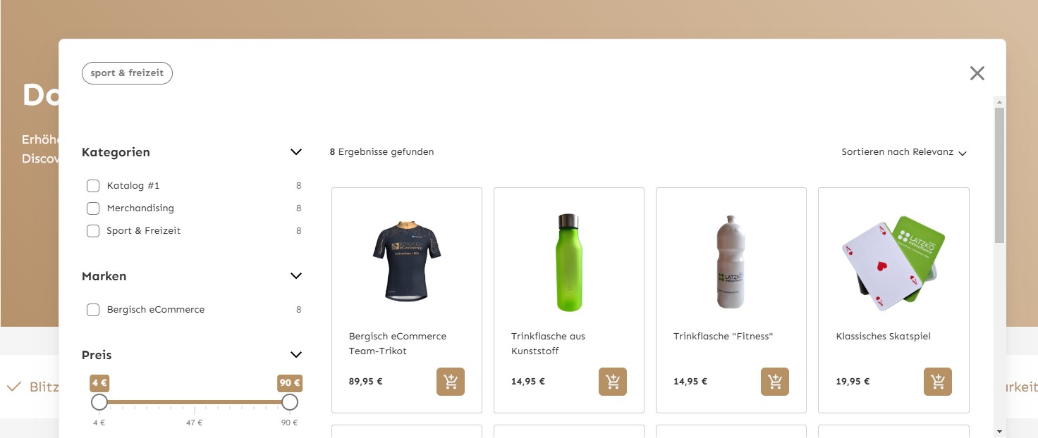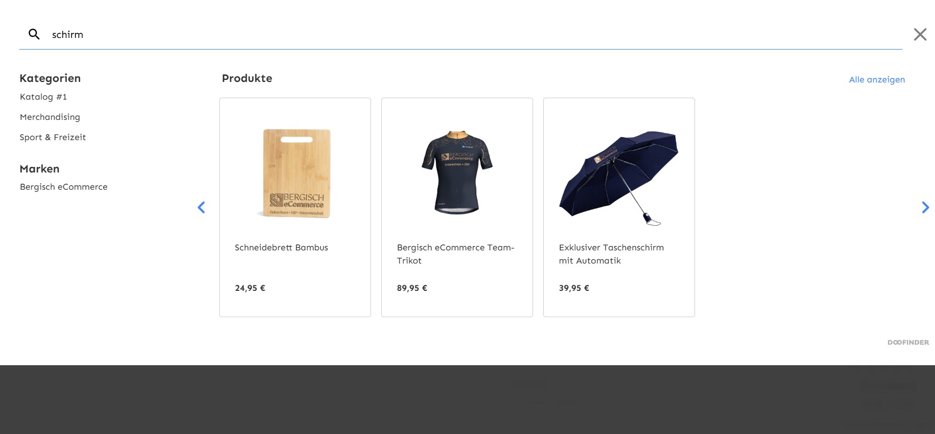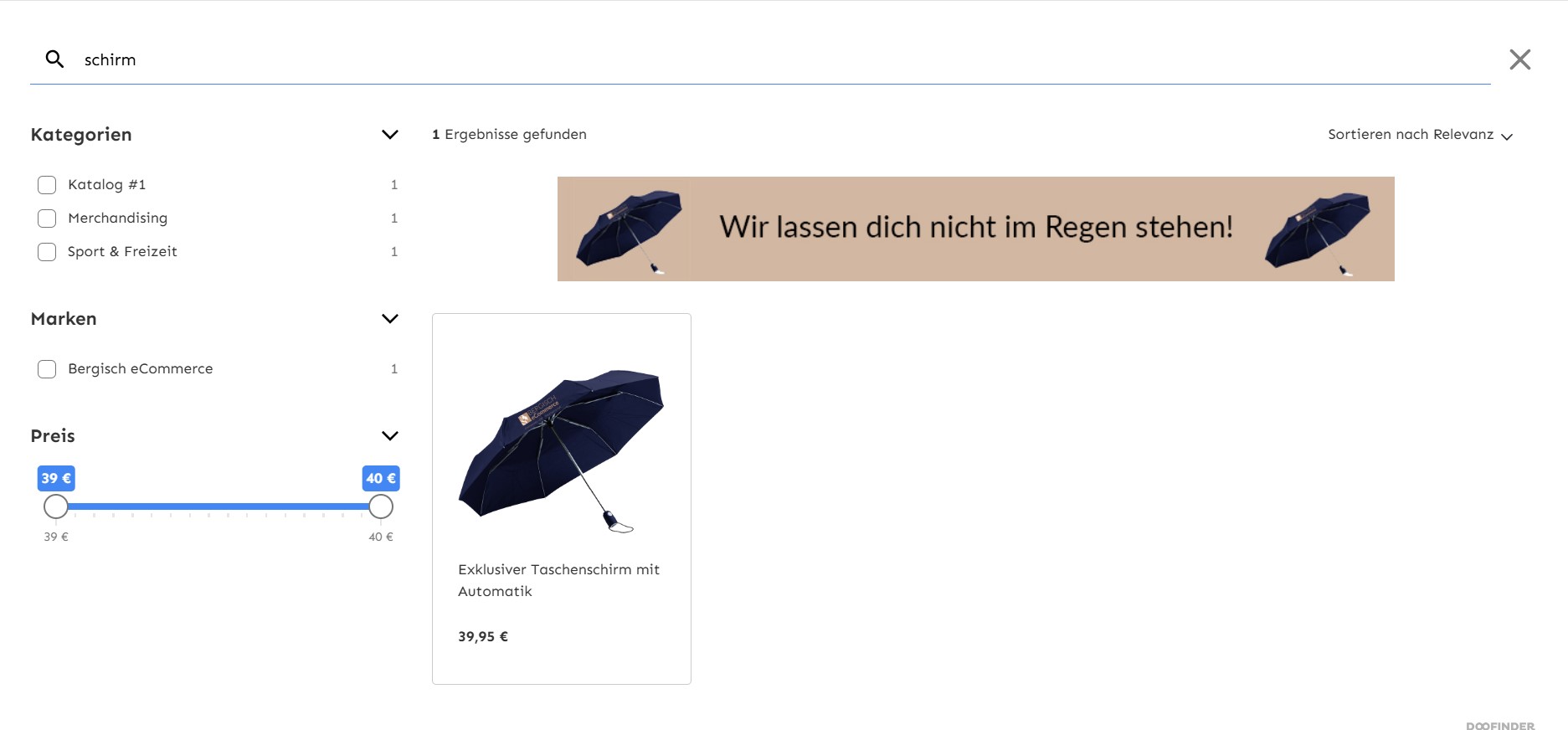 In der Suche können Kategorien und Marken so wie der Warenkorbbutton eingeblendet werden. Über das DooFinder-Admin-Panel können bis zu 10 Artikel definiert werden, die bei allen Suchergebnissen oder bei definierten Suchergebnissen vor den eigentlichen Treffen ausgespielt werden können.