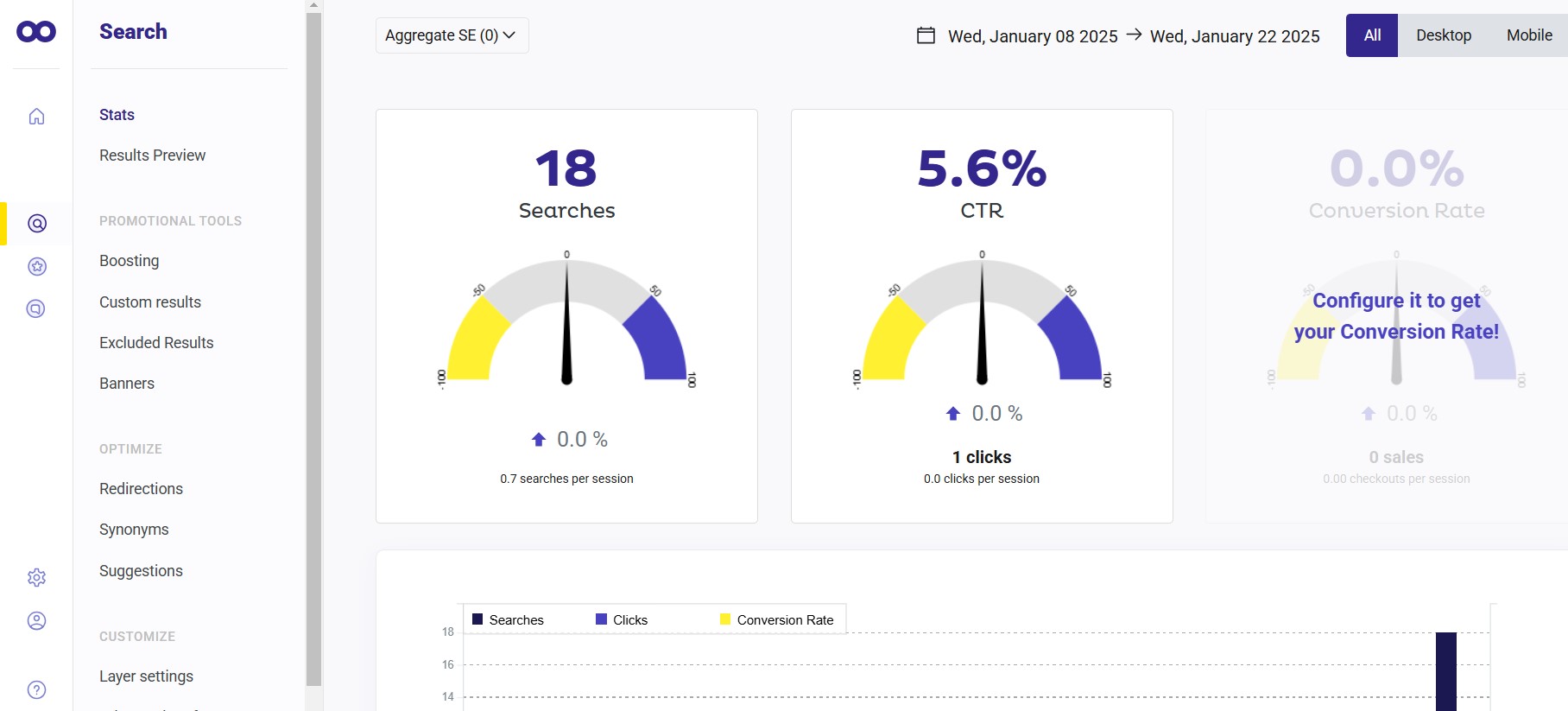 Im DooFinder-Admin-Panel kannst du ganz einfach die Suchanfragen deiner Nutzer auswerten. Du bekommst einen schnellen Überblick über Suchanfragen, Top-Ergebnisse, meistgeklickte Produkte, ungenutzte Chancen und Suchbegriffe ohne Treffer. So kannst du gezielt Maßnahmen ableiten, um dein Sortiment zu optimieren, neue Produkte zu ergänzen oder deine Suche noch besser auf die Bedürfnisse deiner Kunden abzustimmen.