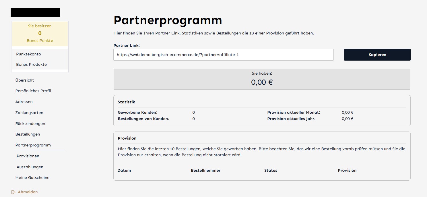 Laden Sie Partner, Blogger oder Influencer ein, sich in Ihrem Shop als Affiliate-Partner zu registrieren. Über ein individuelles Partnerprogramm können Partner andere Kunden werben und dabei attraktive Provisionen verdienen. Jeder Partner erhält einen persönlichen Empfehlungslink, den er flexibel teilen kann. Für jede erfolgreiche Bestellung eines geworbenen Neukunden vergeben Sie automatisch eine Provision.